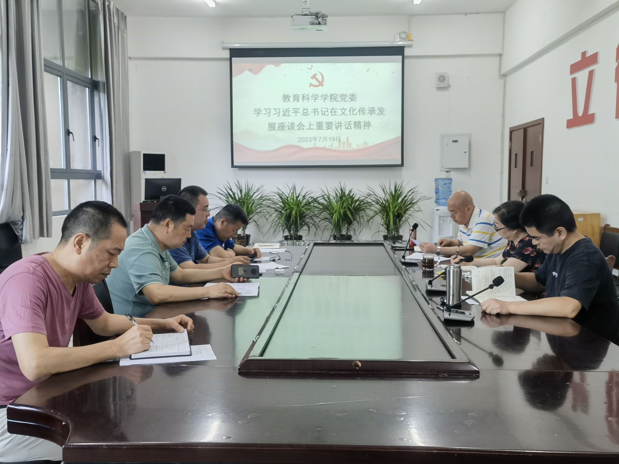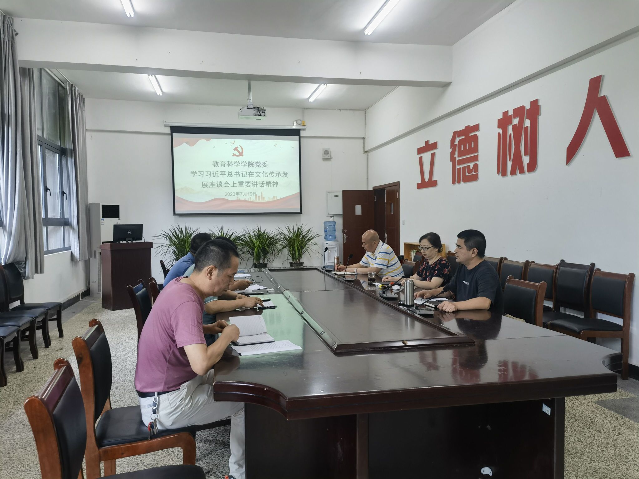 本网讯(文图/杨婷婷)习近平总书记在文化传承发展座谈会上的重要讲话中指出:“在新的起点上继续推动文化繁荣、建设文化强国、建设中华民族现代文明,是我们在新时代新的文化使命。”为深入学习贯彻习近平总书记的重要讲话精神,深刻领悟“两个结合”的重大意义,教育科学学院党委于7月19日召开学习习近平总书记在文化传承发展座谈会的重要讲话精神研讨会。会议由学院党委书记罗立顺主持。