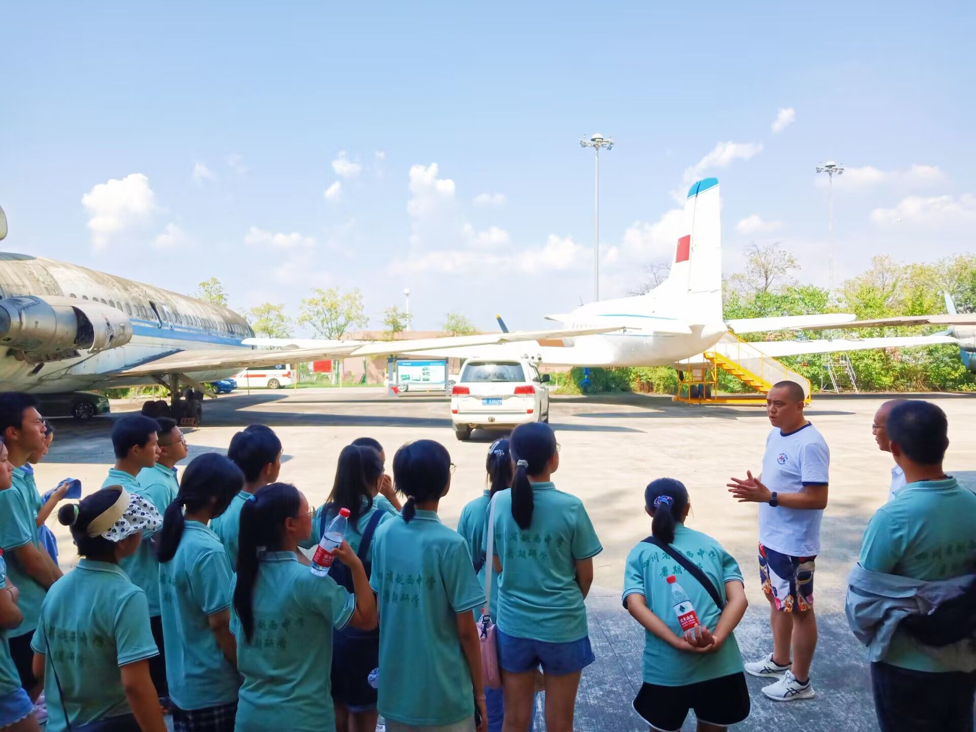 7月17日下午,同学们来到中国民用航空飞行学院,在曾强老师的带领下了解校园环境,参观飞行训练。中飞院黄老师向同学们讲述飞机专业知识,鼓励同学们认真学习,并提出少玩手机游戏、多锻炼身体的宝贵建议。
