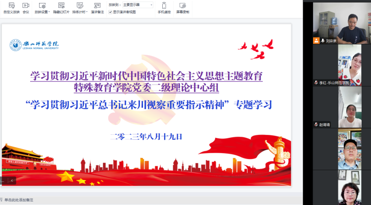 本网讯(文图/杨燕) 8月19日下午,特殊教育学院党委二级理论中心组召开学习贯彻习近平新时代中国特色社会主义思想主题教育专题学习会,学习贯彻习近平总书记来川视察重要指示精神,学院党委二级理论中心组全体成员和教职工党员代表参加了学习。学习会由学院党委书记刘宗泉主持。