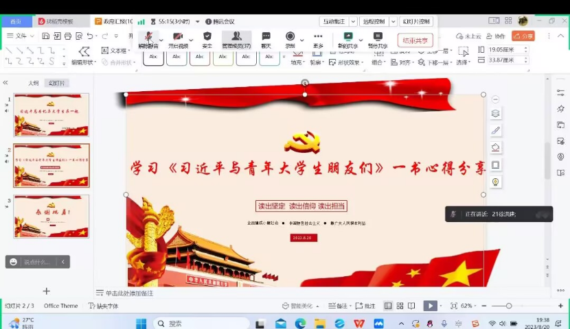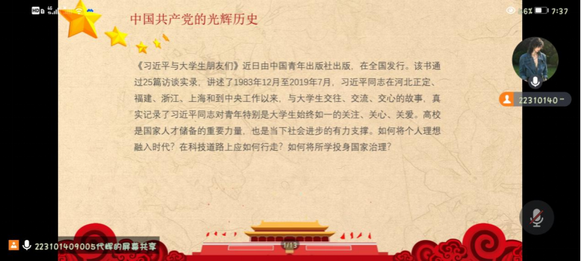 本网讯(文/金雨欣,图/黄泽静)为号召青年学生学习习近平新时代中国特色社会主义思想,争做新时代青年,电子信息与人工智能学院在2023年8月20日组织21级和22级学生在线上开展以“习近平总书记与大学生在一起”为主题的团日活动。本次活动旨在通过各种形式的学习交流和互动,促进党团合作,增强新时代青年的思想修养和团队合作能力。