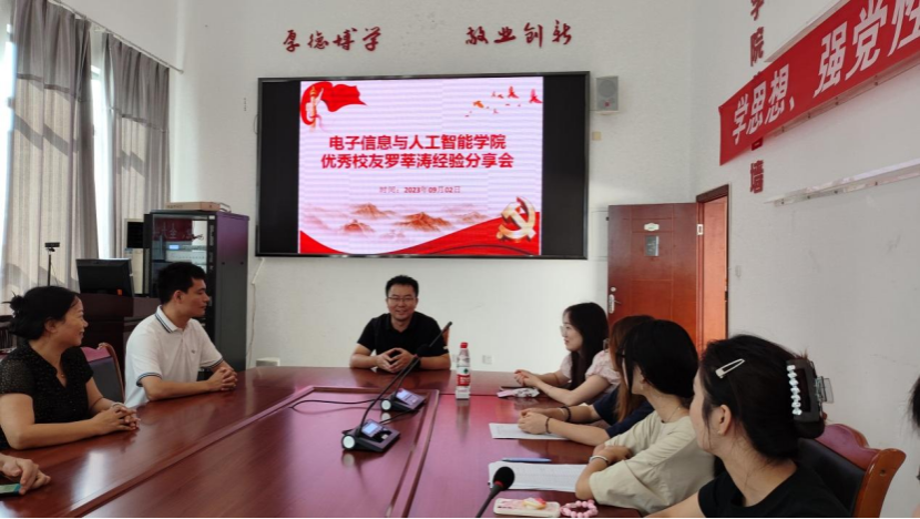 本网讯(文、图/蔡国娇)九月校园金桂飘香,新的学期激情飞扬。在度过了愉快、充实的假期生活后,为了帮助同学们更好地规划自己的大学生活,电子信息与人工智能学院9月2日上午十点在特教C501开展优秀校友经验分享会。本次会议由优秀校友罗莘涛主讲,辅导员谭红梅、强光平、雷雄锴、肖苗和部分学生参加。