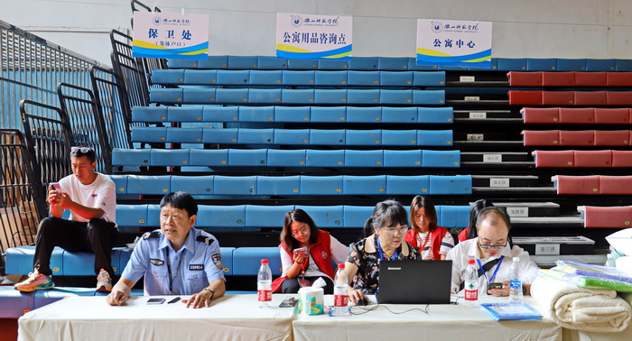 在篮球馆、足球场新生接待现场,后保部提前做好了水电保障工作,安装了专用输电线、插座等,并在新生报到期间,每天在报到现场配置专职水电值班员,确保新生报到现场水电保障万无一失。校医院在新生报到现场安排了值班点,全天候待命,为新生、家长及迎新工作人员的健康保驾护航。公寓中心提前完成783名专升本新生、3971名本科新生的床位分配工作;各楼幢提前做好卫生清扫工作及新生报到入住准备工作;在报到现场设置了住宿服务咨询点,为远到而来的新生提供热情、周到、耐心、细致的住宿服务咨询。物资中心派出中型客车作为摆渡车,参与迎新和入伍学生运送,从南校区足球场到百果园宿舍,两天共运送学生及家长40多次,满足了师生需求。