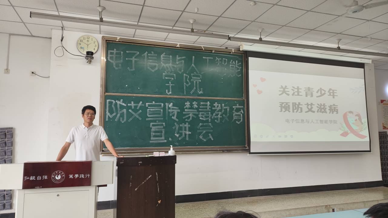 本网讯(文/陈圣 图/蔡国娇)为了更好地宣传禁毒防艾的相关知识,提高同学们的警惕和防范意识,增强同学们自我保护的能力。9月12日早上8:30,电子信息与人工智能学院组织开展“禁毒防艾”宣传教育讲座,此次讲座由23级辅导员雷雄锴主持,23级全体新生共同参与。