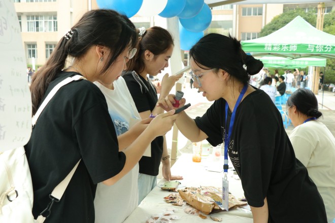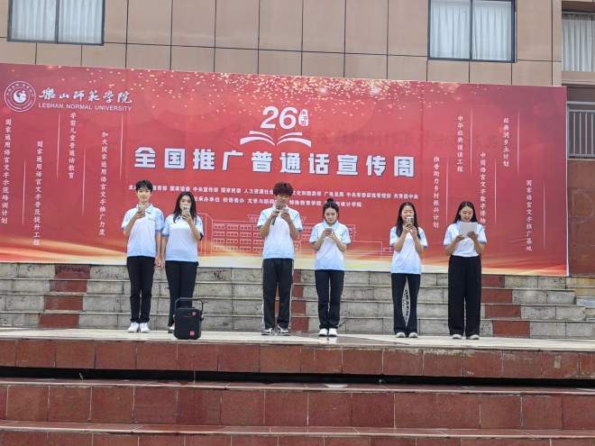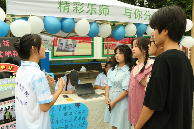 推广普通话,师生齐行动。本次活动,首先由特教学院为大家带来手语展示,再由文新艺术团为在场老师和同学表演朗诵《献礼二十大,颂歌献给党》和带来歌曲《字正腔圆》。这些表演以生动有趣的方式让同学们了解到了普通话普及的重要性,也将活动氛围推至顶点。在活动现场共设置了四大板块。首先是普通话推广风采展示板块,该板块共有四个风采展示位,其分别由来自马边、峨边、张村、蓬溪的四个推普队伍为在校师生介绍暑期推普成果。这不仅展示了我院暑期实践活动成果,更激发了广大学生对普通话推广的积极性。其次是普通话游戏板块,该板块共设两个展示位。展示位前人来人往,同学们积极挑战着“异读词”和“平仄韵心间”,“一平一仄”表现出了同学们对推广普通话的热情和对普通话的认可度。除此以外,本次活动还设置了抽奖处,抽奖处的设立使得同学们参与活动的积极性高涨,推动了活动良性进行。