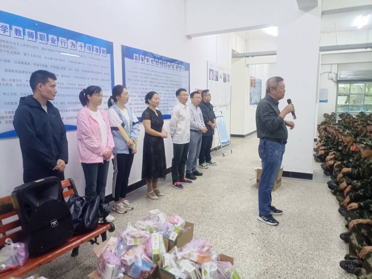随后,学院领导以及各位老师们为同学们送上暖心礼物,这份礼物不仅寄托着老师们的温暖关怀,亦承载了对同学们的殷切期望。相信同学们将以更加饱满的热情和坚定的毅力完成军训任务,以优异的成绩回报学院领导以及老师们的期望和关怀。
