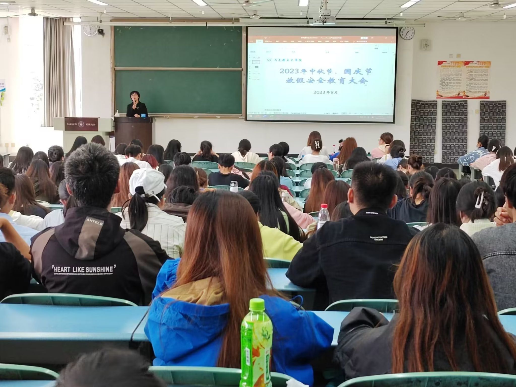 大会最后,张红丽宣读中秋节、国庆节放假通知,并对放假及返校相关工作事宜进行了具体的安排。同时,她针对各大高校发生的网络诈骗案件及交通安全意外事故,提醒同学们在假期期间要树立起“安全第一”的理念。会后,各班班长分别发放假期去向表及安全责任告知书,钟永淑、张红丽也提前预祝同学们中秋节、国庆节快乐。