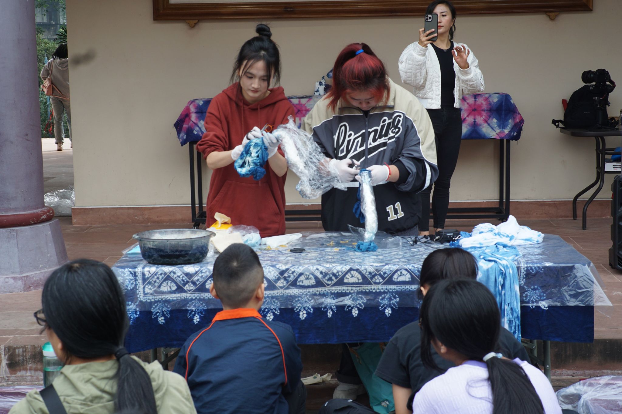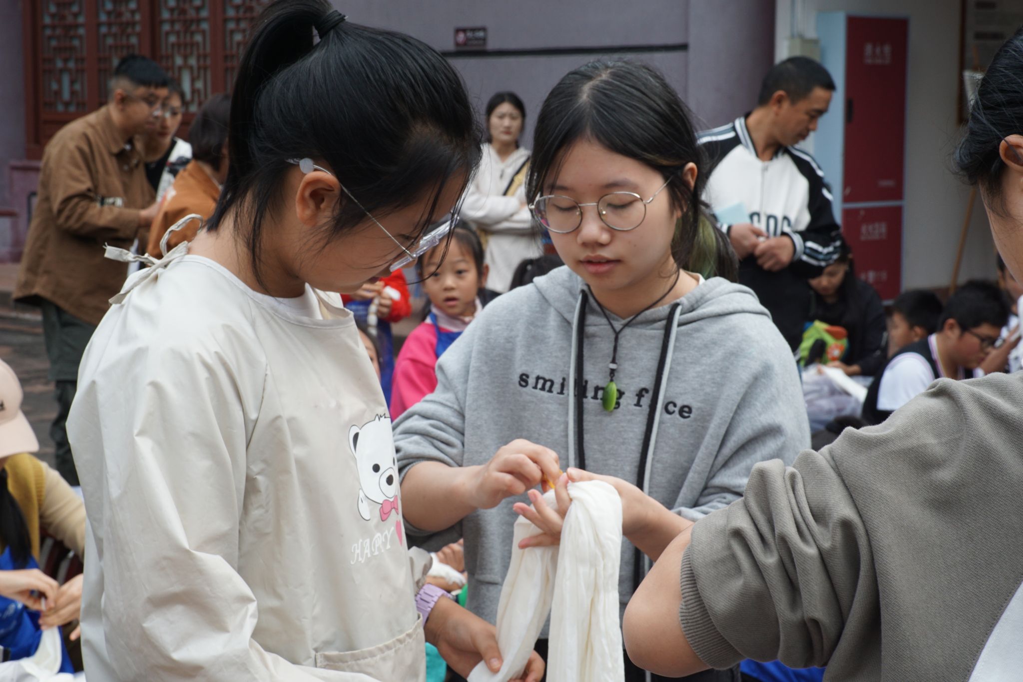 美术与设计学院“由染而生”非遗传播服务团队的6名成员在指导教师王永清的带领下,为50名体验者提供了扎染研学体验服务。活动中,志愿者们参与了原材料准备、场地布置、组织教学、实践辅导等工作,热情周到地为体验者服务,让研学活动有序开展,圆满完成研学任务,受到主办方好评。本次活动让更多的人与峨眉扎染近距离接触,感受优秀传统文化所带来的独特魅力和艺术价值,树立文化自信。