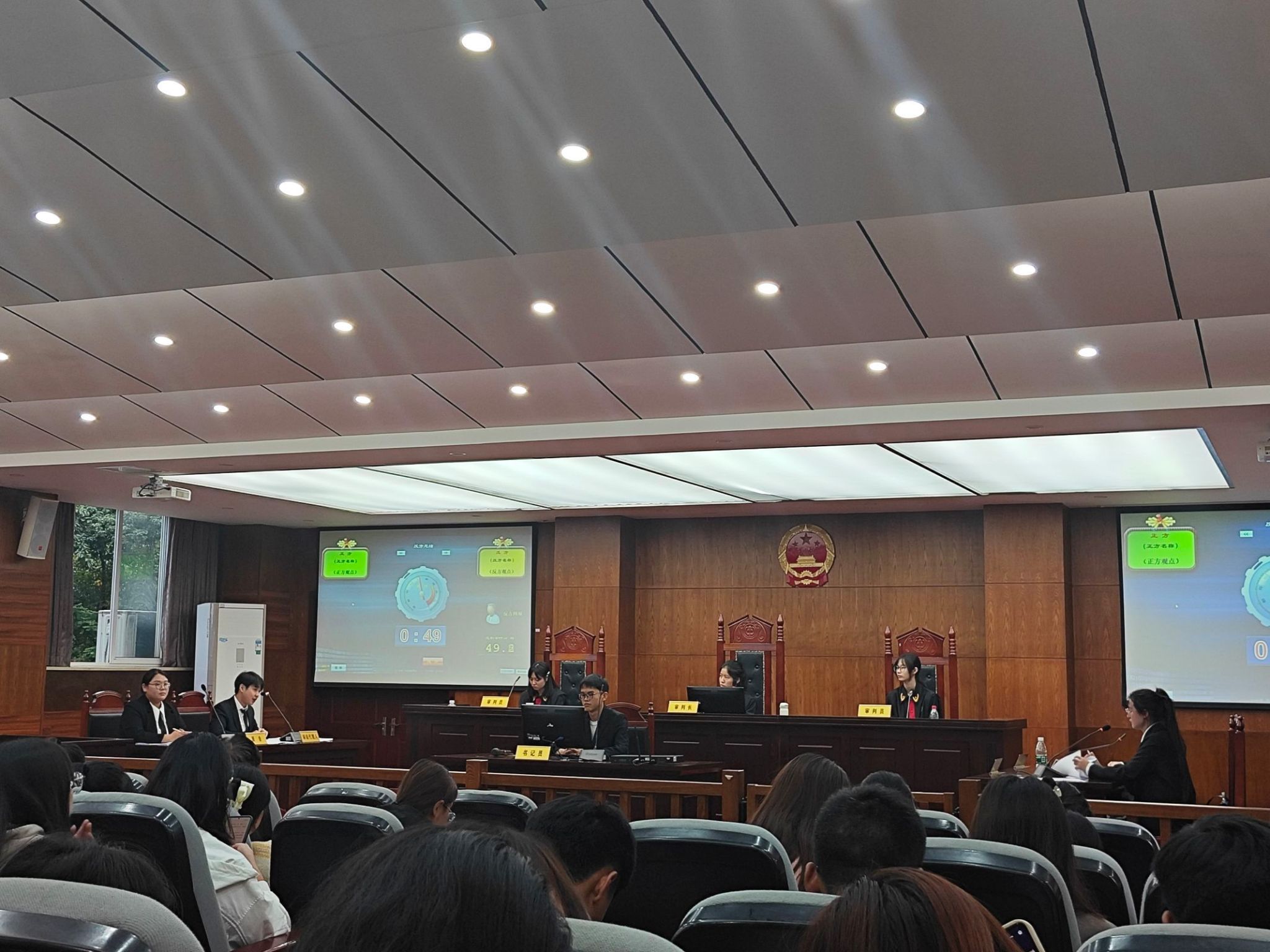辩论活动中,同学们分别扮演法官、当事人、代理人、律师、书记员等角色;在主审法官的主持下通过陈述、举证质证和法庭辩论等环节,进行了一场激烈而富有挑战性的法律辩论。庭审中,同学们运用了所学的法律知识,遵循庭审程序与规则,以事实为依据、法律为准绳,充分展示了扎实的法律知识和法律素养,以及良好的庭审技巧和语言表达能力。