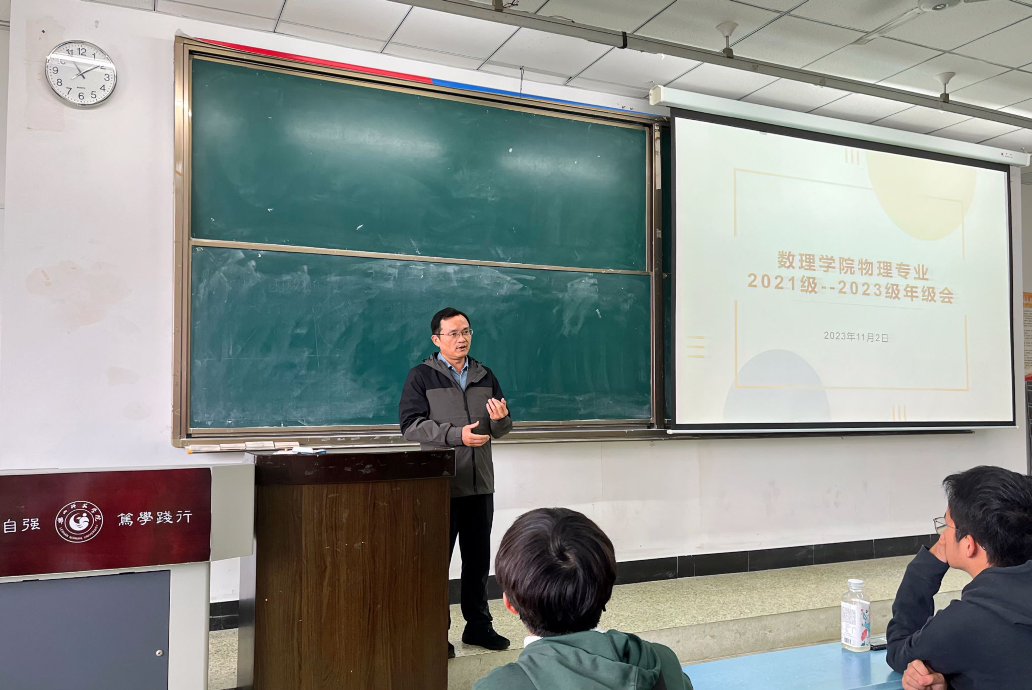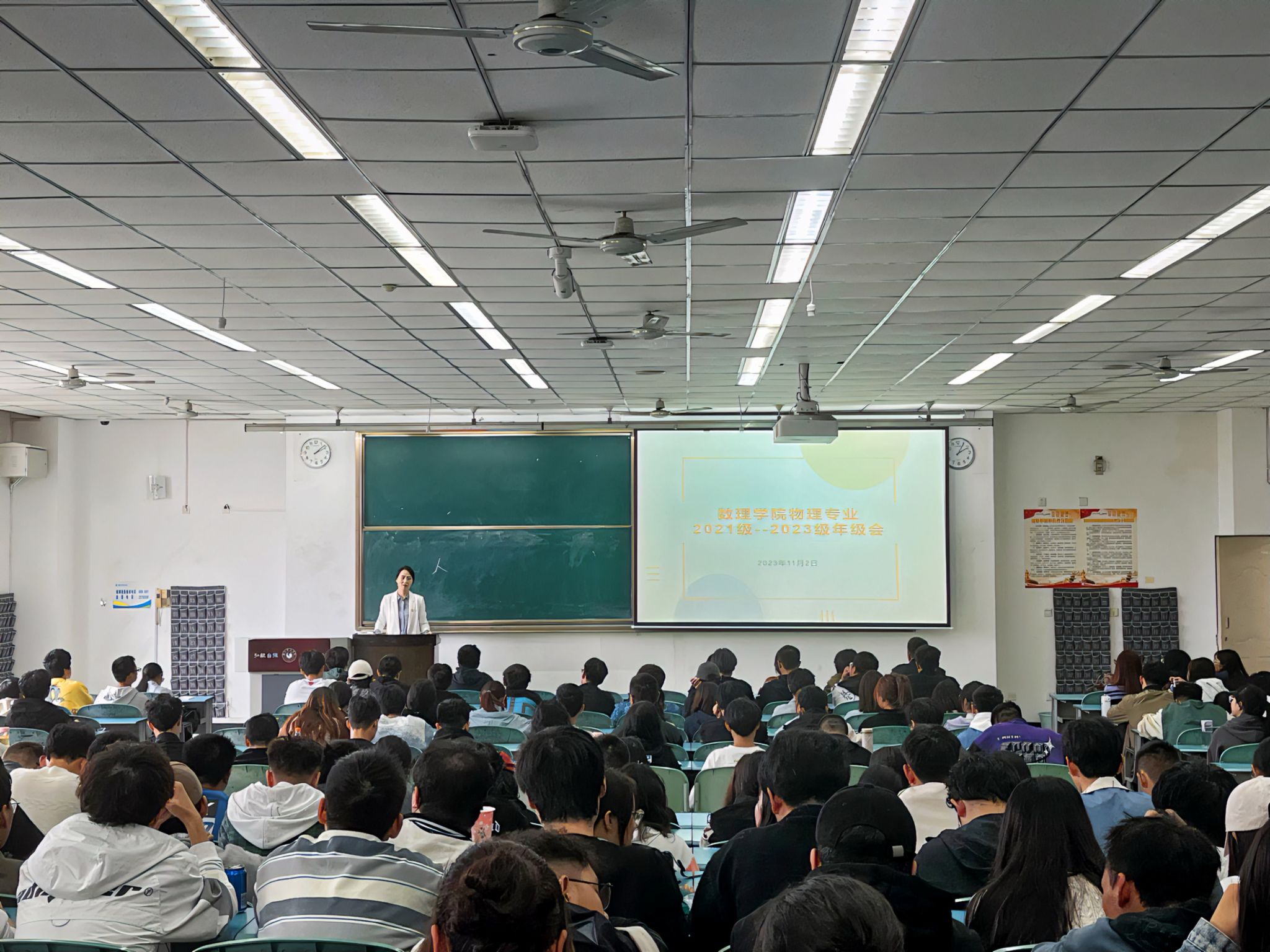 本网讯(文/任佳敏 图/杨依林) 11月2日下午,数理学院召开物理专业学生诚信教育暨师范专业认证动员会,数理学院院长屈小兵、党委副书记左莉出席,2021-2023级辅导员、物理专业全体学生学参加,会议由辅导员陈新凯主持。