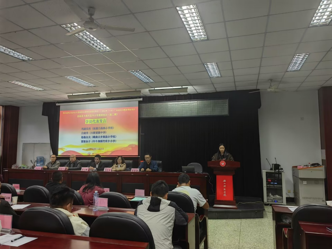 本网讯(文/陈梦琪 图/巴玉宁、唐菀)11月9日下午,四川省2022年基础教育教师培训委托项目——凉山州“一对一”院校对口精准帮扶项目(第二期)结业典礼在弘毅楼413教室进行。教育科学学院院长兼国培首席专家汪红烨,党委书记罗立顺,党委副书记何晓军,副院长唐前军,班主任巴玉宁及49名学员参加,结业典礼由副院长徐世鼎主持。