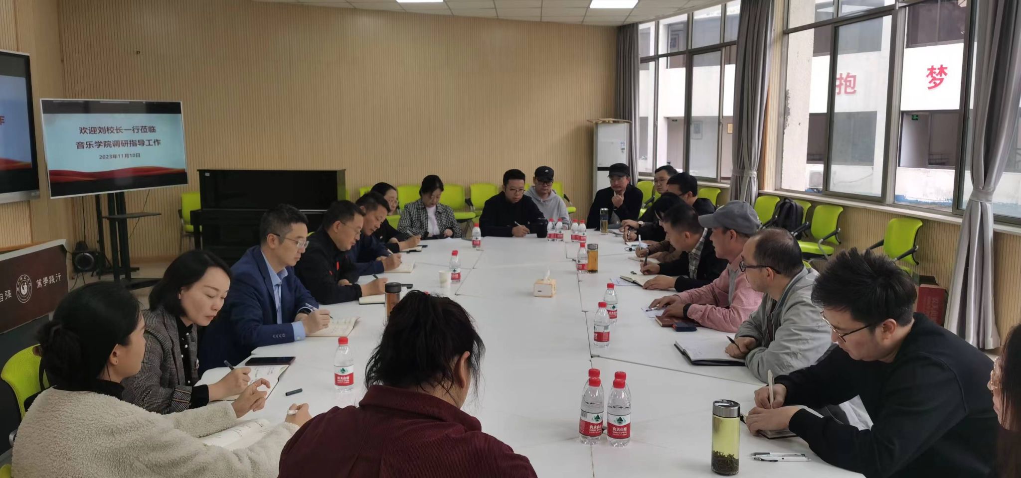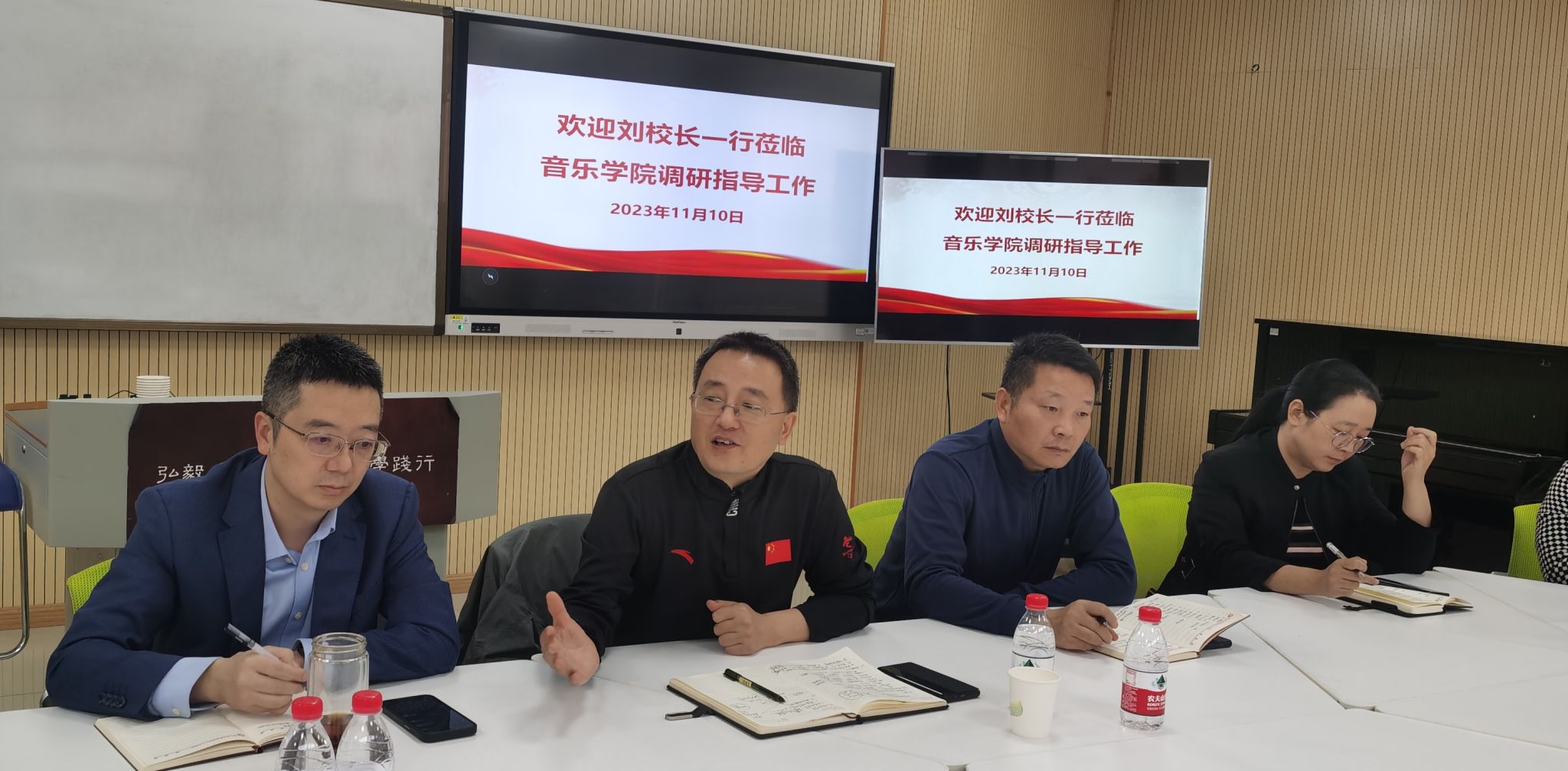 刘进悉心听取汇报,对学院各项工作取得的成绩给予了肯定,他指出音乐学院整体发展态势良好,在内设机构调整、科研平台建设等方面采取了很多可行的措施,取得了不错的成绩。对学院发展中存在的困难和问题进行了分析,并提出了解决的思路和方案。对学院下一步的发展提出了希望和要求——“蓄大气、树正气、造生气”。“蓄大气”就是要有大气度大胸襟,深入学习党的创新理论,继续深化主题教育成果,在新时代高等教育改革大潮中思考、谋划,梳理“十四五”规划,为“十五五”发展蓄力量。“树正气”就是要求教师坚守职业道德、职业操守、职业理想,切实加强师德师风建设,特别是班子成员要以自身行为示范带动师风,以师风带动学风,让音乐殿堂上既有音乐之美的声音又有浩然正气的声音,真正全面落实立德树人的根本任务。“造生气”就是要有蓬勃向上、生机盎然的朝气。音乐是一个充满活力的学科,今后一定要充分发挥学科优势,凸显专业特色,跟上时代步伐。班子要发挥聚人心、增合力的作用,带领全体教职工一起干事创业,将音乐学院这两年良好的发展态势维系好,争取更大的发展。