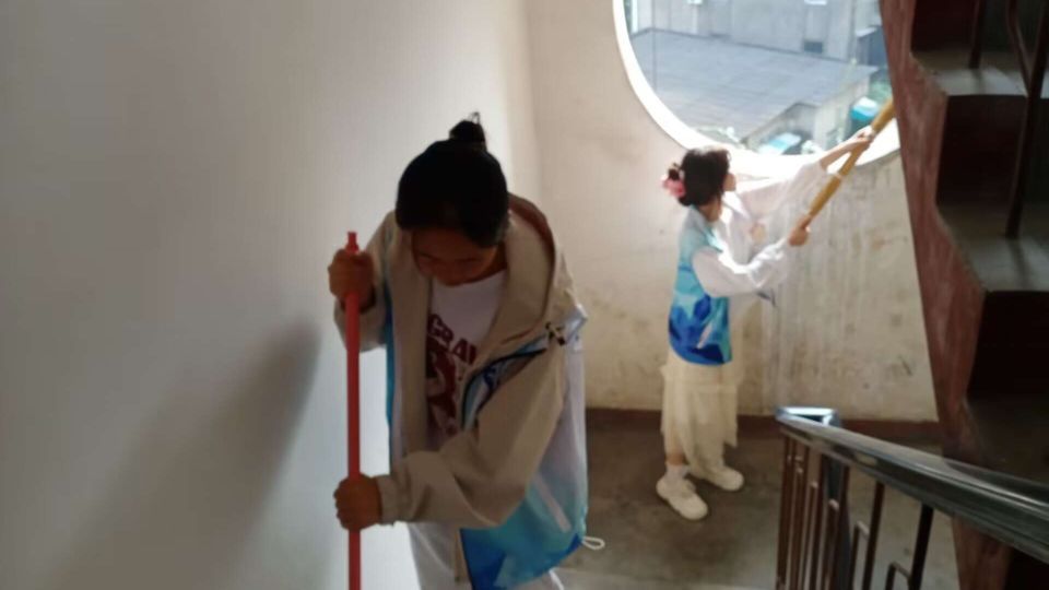 活动伊始,志愿者在石碑门清点人数后做好出发准备,随后由青志中心干事带领前往青果山社区。到达青果山社区后,社区工作人员安排志愿者们在社区背后居民楼做清洁工作。在分配完清洁工具后,志愿者们开始分工协作,居民楼共4个单元,志愿者们分成四个小组,依次清理了楼梯间的天花板、管道的蛛丝以及楼梯上的杂物,同时对楼旁的停车棚也进行了清理。打扫完毕后,志愿者们归还工具,拍照留念,随后到干事处签退,整个活动有序进行。至此,活动结束。