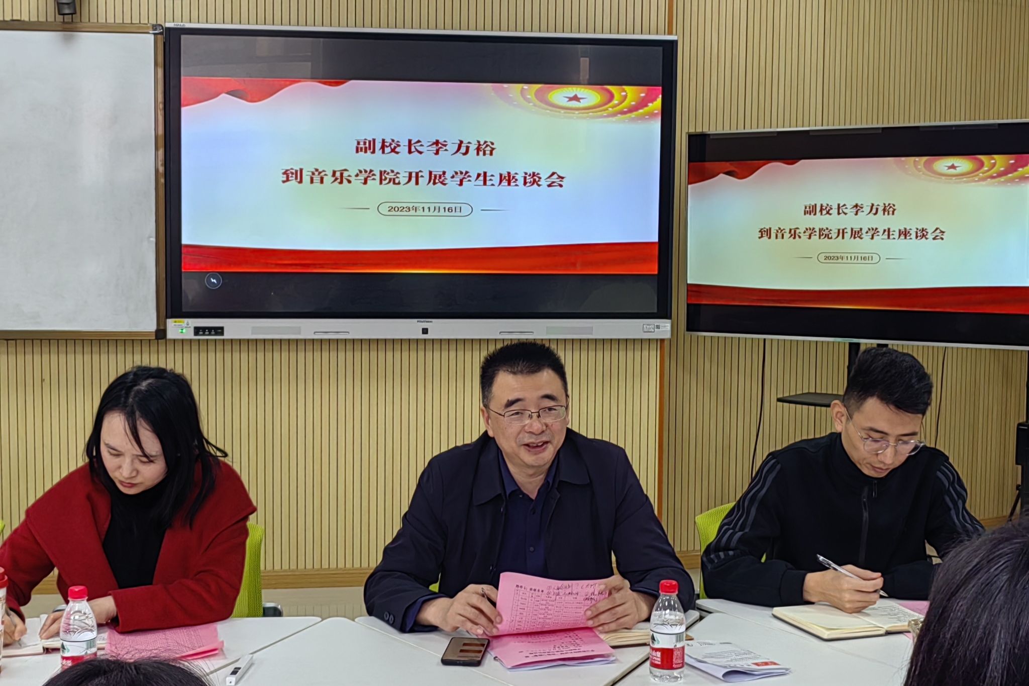 本网讯(文/郭元红 图/周琼怡)11月16日,党委常委、副校长李方裕在音乐学院智慧教室一为音乐学院学生讲授“形势与政策”课、召开师生交流座谈会,音乐学院师生代表共计33人参加本次授课和座谈会。