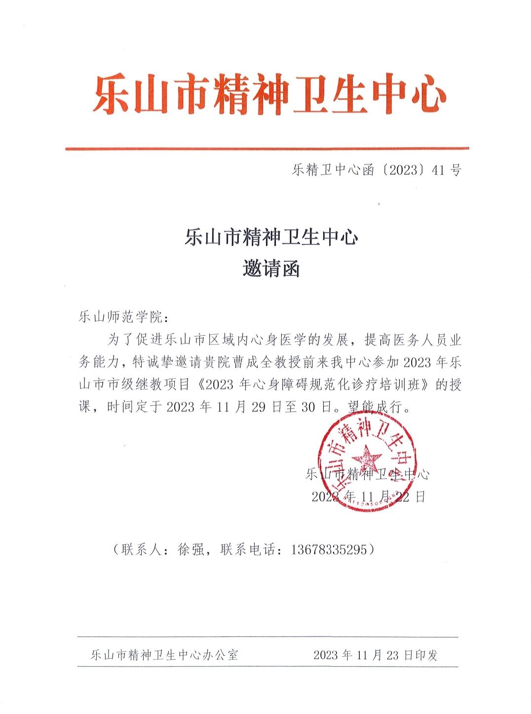 本网讯(文、图/童超)11月30日,生命科学学院曹成全教授受乐山市精神卫生中心邀请,在2023年心身障碍规范化诊疗培训班上做题为《昆虫宠物在心理疗愈中的应用》的报告,生命科学学院和特殊教育学院、康复学院共计十余名师生同行参会。